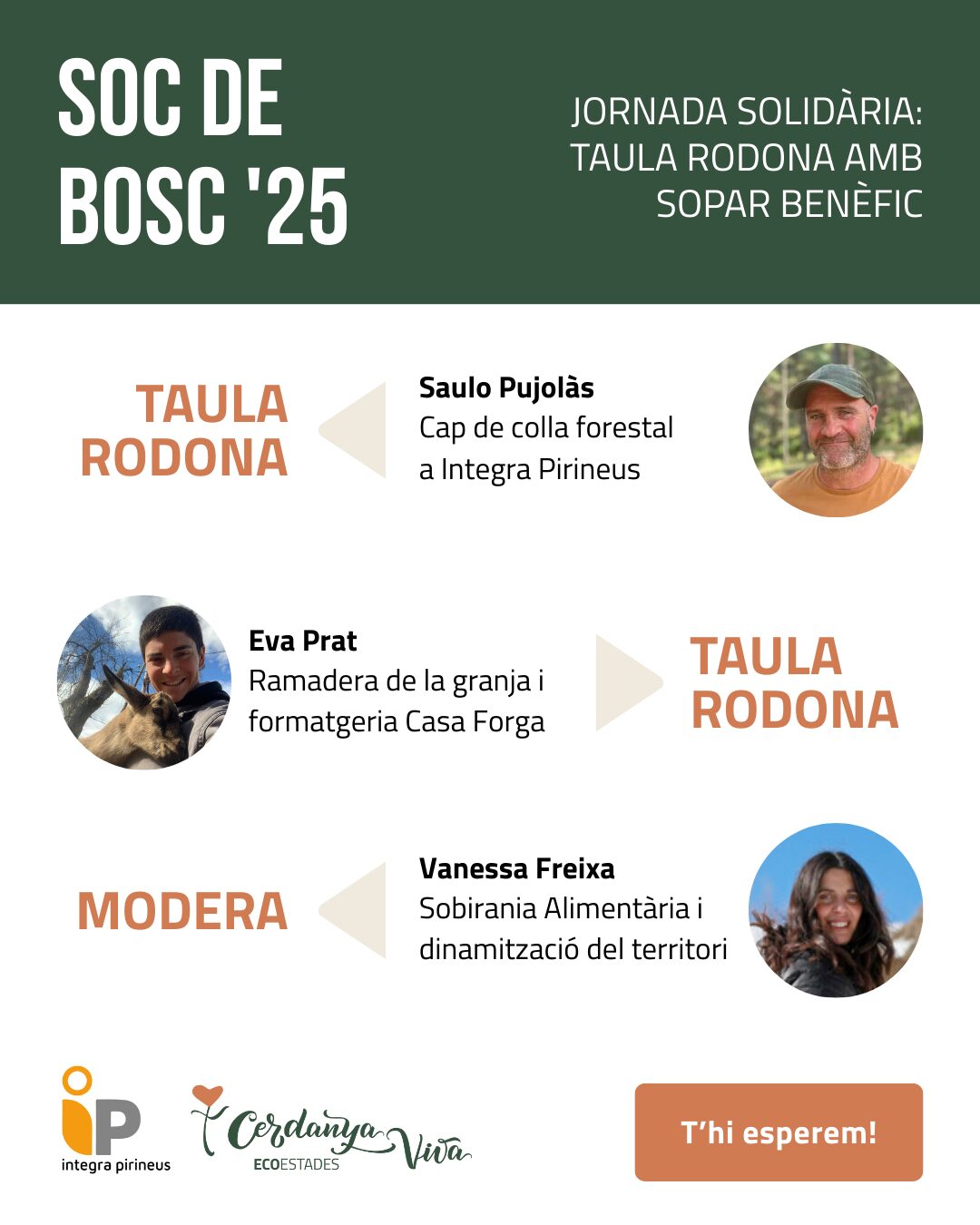 Cerdanya Viva Ecoestades i Integra Pirineus us conviden a una jornada per reflexionar sobre els boscos del Pirineu. “Soc de Bosc ’25” és una iniciativa que combina divulgació, reflexió i acció solidària per posar el focus en la situació dels boscos del Pirineu i un àpat solidari en el qual degustar productes de proximitat.