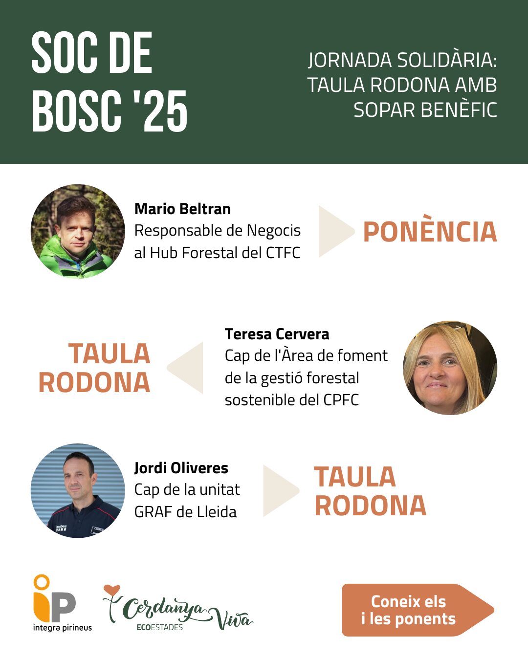 L’objectiu d’aquesta jornada és generar consciència i mobilitzar la ciutadania per afrontar reptes com la gestió forestal sostenible, la prevenció d’incendis i la relació entre el paisatge i l’economia local. Per aquest motiu, es comptarà amb una primera ponència a càrrec de Mario Beltran (responsable de negocis al Hub Forestal de CTFC) sobre l’evolució dels boscos del Pirineu. A partir d’aquesta xerrada es parlarà sobre com afrontar el present i el futur dels boscos pirinencs amb una taula amb experts: Teresa Cervera (Cap de l’Àrea de foment de la gestió forestal sostenible del CPFC), Jordi Oliveres (Cap de la unitat GRAF de Lleida), Saulo Pujolàs (Cap de colla forestal a Integra Pirineus) i Eva Prat (Ramadera de la granja i formatgeria Casa Forga). Aquesta taula anirà dinamitzada per Vanessa Freixa, experta en sobirania alimentària i dinamització territorial.